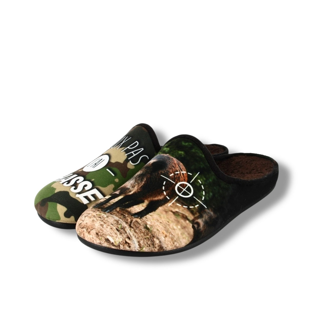 Les pantoufles « Je peux pas, j’ai chasse » apportent une touche d’humour à vos moments de détente.